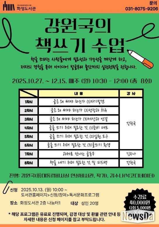뉴스다 최광묵 기자 | 고양특례시는 10월 27일부터 12월 15일까지 매주 월요일 오전 10시 30분부터 12시까지, 화정도서관 2층 나눔터1에서 ‘강원국의 책쓰기 수업’프로그램을 운영한다고 밝혔다.