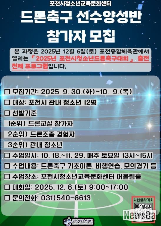 뉴스다 최광묵 기자 | 포천시청소년재단 포천시청소년교육문화센터는 오는 10월 18일부터 11월 29일까지 매주 토요일, ‘드론축구 선수양성반’을 운영한다.