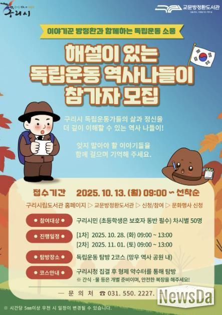 뉴스다 최광묵 기자 | 구리시는 오는 10월 13일부터 27일까지 교문 방정환 도서관에서 진행하는 ‘해설이 있는 독립운동 역사 나들이’ 프로그램의 참여자를 모집한다고 밝혔다.