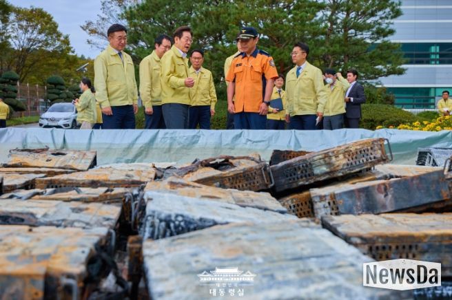 이 대통령은 먼저 화재구역 배터리를 모아 둔 냉각 침수조를 둘러본 뒤, 실제 화재가 발생한 5층 전산실을 찾아 피해 상황을 점검했다.