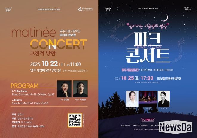 양주시가 깊어가는 가을 정취 속에서 시민들에게 품격 있는 문화예술 향유 기회를 제공하기 위해 오는 22일 ‘마티네 콘서트’와 25일 ‘파크콘서트’를 연이어 개최한다.