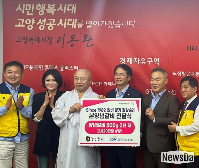뉴스다 최광묵 기자 | ㈜전한의 외식브랜드 강강술래(대표 노상환)가 10월 10일, 고양특례시에 본양념갈비 500g 2,000개(2,820만 원 상당)를 기탁했다. 이번 전달식은 고양특례시청 열린시장실에서 진행됐으며, 이동환 고양특례시장, 김민숙 고양특례시의원(고양, 관산, 원신), 노상환 강강술래 대표, 김응화 고양시사회복지협의회 회장이 함께 자리했다.