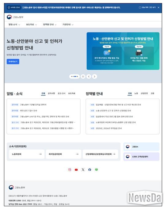 오늘부터는 임시 대표 누리집 서비스를 개시(15시 이후 ~)하여 입법예고 등 공지 사항, 공고 및 고시, 보도자료 등을 확인 할 수 있으며, 고용, 노동, 산업안전분야 정책도 게시판을 통해 편리하게 찾아볼 수 있다.