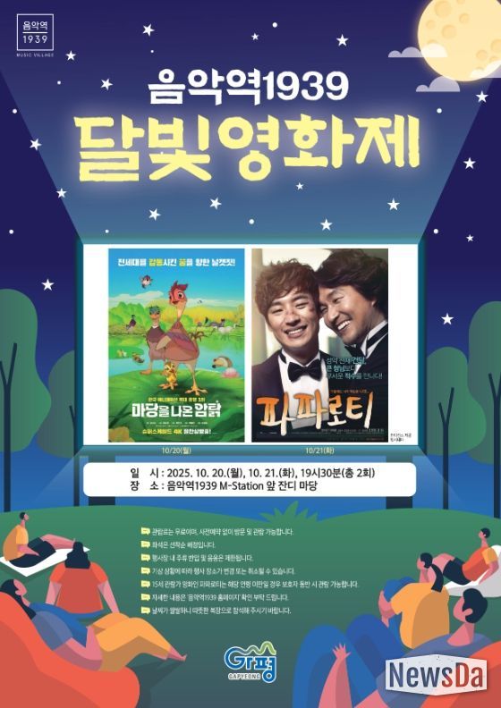 상영작은 △20일 오후 7시 30분 애니메이션 ‘마당을 나온 암탉’(전체관람가‧93분) △21일 오후 7시 30분 영화 ‘파파로티’(15세 이상 관람가‧127분)로, 음악역1939 특유의 감성적인 분위기 속에서 관객들에게 따뜻한 휴식과 여유를 선사할 예정이다.
