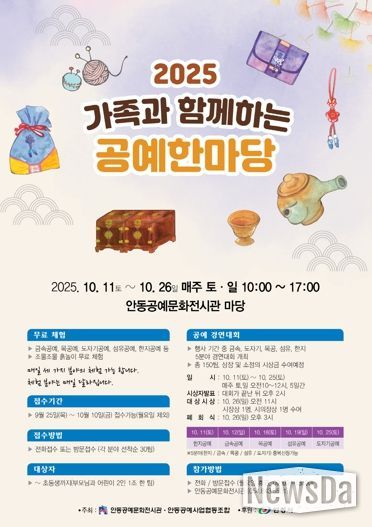 뉴스다 최광묵 기자 | 안동공예문화전시관이 주최하고 안동시가 후원하는 ‘2025 가족과 함께하는 공예한마당’ 행사가 한창 준비되고 있다. 이번 행사는 공예품의 아름다움을 전달하고 안동시민이 가까운 곳에서 작품을 접하며 공예에 대한 친근한 경험을 할 수 있도록 기획됐다.