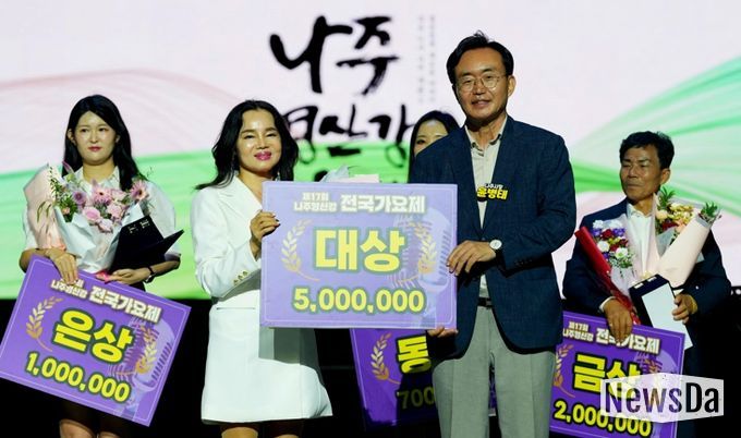 뉴스다 최광묵 기자 | ‘2025 나주영산강축제’ 국민참여 프로그램중 하나인 ‘제17회 나주 영산강 전국 가요제’에서 천년학(김용림)을 열창한 장성희 씨(광주광역시)가 영예의 대상을 차지해 부상으로 상금 500만 원을 수여 받았다.