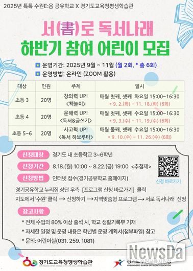 뉴스다 최광묵 기자 | 경기도교육청평생학습관이 수원교육지원청과 함께 어린이 독서 습관 형성과 사고력 향상을 위하여 초등학교 3~6학년을 대상으로‘서(書)로 독서나래’를 운영한다.