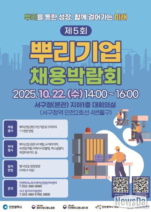 뉴스다 최광묵 기자 | 인천테크노파크(인천TP)는 뿌리산업 인력난 해소와 지역 고용 활성화를 위해 10월 22일 14시에 인천 서구청(본청) 대강당에서 ‘제5회 뿌리기업 채용박람회’를 개최한다.