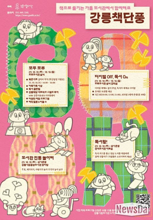 뉴스다 최광묵 기자 | 강릉시립도서관은 오는 10월 18일부터 10월 19일까지 모루도서관을 중심으로 시민과 함께 참여하는 2025년 ‘강릉 책단풍’을 운영한다.