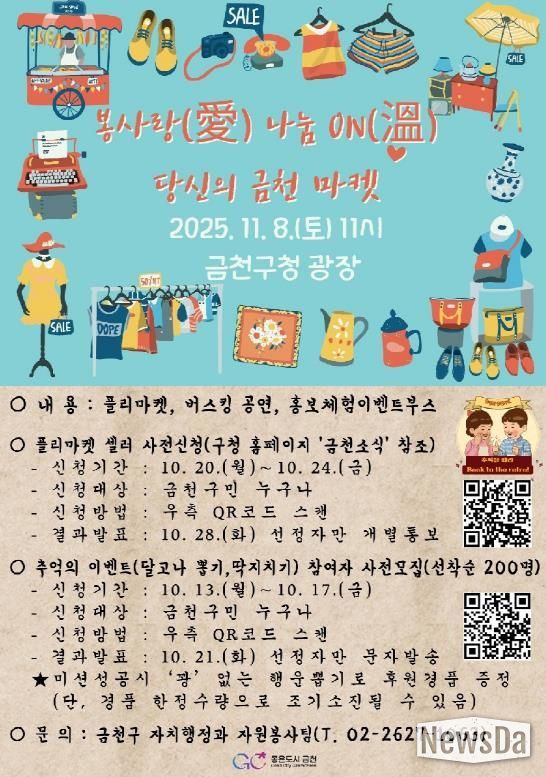 뉴스다 최광묵 기자 | 금천구는 오는 11월 8일 금천구청 광장 앞에서 ‘봉사랑(愛) 나눔ON(溫), 당신의 금천마켓’을 연다고 밝혔다.