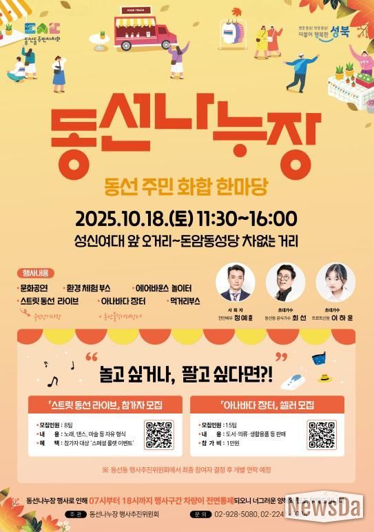 뉴스다 최광묵 기자 | 서울 성북구가 오는 10월 18일 오전 11시 30분부터 오후 4시까지 성신여대 앞 오거리에서 돈암동성당 구간까지 이어지는 도로에서 ‘2025년 차 없는 거리 동선나누장’을 개최한다.