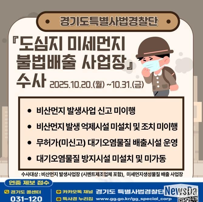 뉴스다 최광묵 기자 | 경기도 특별사법경찰단은 오는 20일부터 31일까지 2주간, 도심지 내 미세먼지 주요 발생 사업장을 대상으로 불법행위를 집중 수사한다.