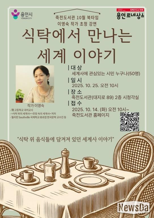뉴스다 최광묵 기자 | 용인특례시는 25일 오전 10시 죽전도서관 시청각실에서 죽전도서관 북타임 작가초청강연회 ‘식탁에서 만나는 세계 이야기’를 연다고 13일 밝혔다.