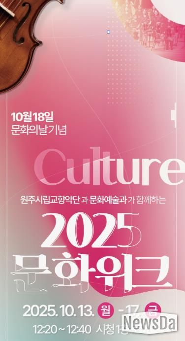 뉴스다 최광묵 기자 | 원주시와 원주시립교향악단은 10월 18일 ‘문화의날’을 기념해, 10월 13일부터 17일까지 ‘2025 문화위크’를 운영한다.