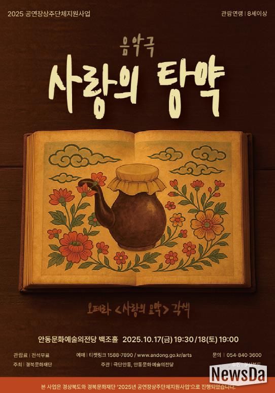 올해 선정된 상주단체 ‘극단안동’은 한국적 소재를 바탕으로 연극과 뮤지컬, 음악극, 거리 퍼포먼스 등 다양한 장르를 넘나들며 활발한 창작 활동을 이어가고 있다. 창작 음악극 '사랑의 탕약'은 10월 17일 오후 7시 30분과 18일 오후 7시, 양일에 걸쳐 안동문화예술의전당 백조홀 무대에서 열린다.