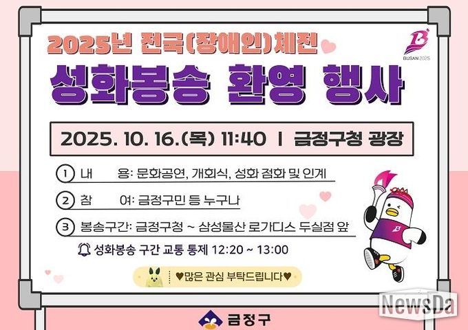 뉴스다 최광묵 기자 | 부산시 금정구는 오는 10월 16일 제106회 전국체육대회 및 제45회 전국장애인체육대회의 성공적인 개최를 위한 성화봉송 환영 행사를 개최한다고 밝혔다.