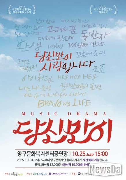 뉴스다 최광묵 기자 | 양구문화재단은 깊어가는 가을, 가족 모두가 함께 즐길 수 있는 뮤지컬 ‘당신만이’를 오는 25일 오후 3시, 양구문화복지센터 공연장에서 선보인다.