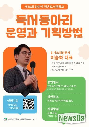 뉴스다 최광묵 기자 | 천안시는 오는 31일 신방도서관에서 ‘제15회 하반기 작은도서관학교’를 운영한다고 13일 밝혔다.