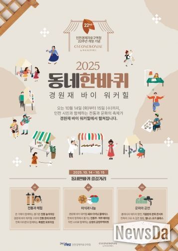 뉴스다 최광묵 기자 | 인천경제자유구역청은 오는 14일과 15일 이틀간 경원재 한옥호텔에서 제2회 경원재 시민페스티벌 ‘2025 동네한바퀴 경원재바이워커힐’을 개최한다고 밝혔다.