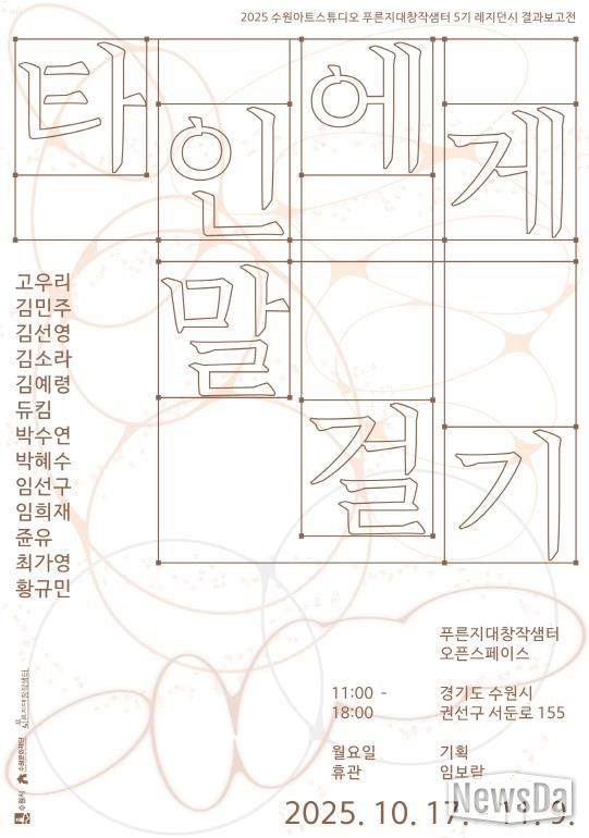뉴스다 최광묵 기자 | 수원문화재단은 오는 10월 17일부터 11월 9일까지 약 3주간 탑동 시민농장에 자리한 수원아트스튜디오 푸른지대창작샘터에서 5기 레지던시 참여작가 13인의 올 한 해 작품 활동 성과를 공유하는 결과보고전 '타인에게 말 걸기'를 개최한다.