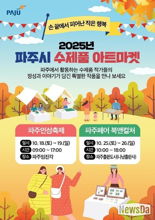 뉴스다 최광묵 기자 | 파주시는 오는 18일부터 19일까지 이틀간 열리는 ‘파주인삼축제’와 오는 25일부터 26일까지 개최되는 ‘파주페어_북앤컬처’ 행사장에서 지역 수공예 작가들이 참여하는 ‘수제품 아트마켓’을 운영한다.