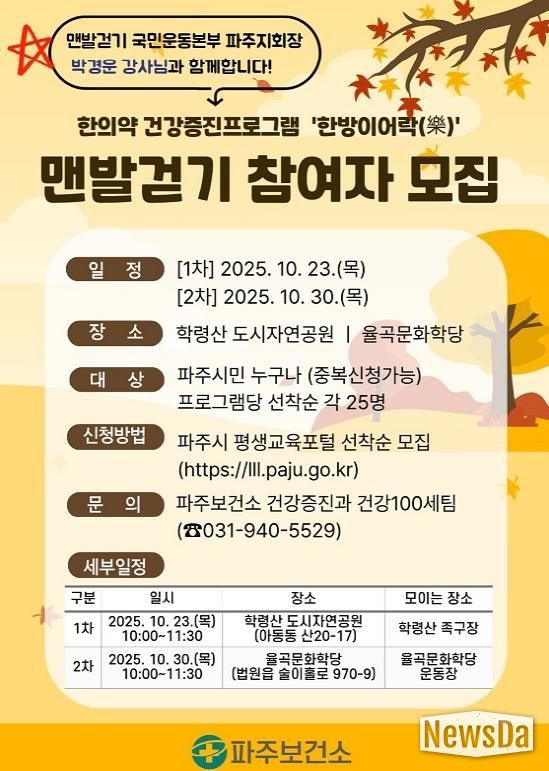 이한상 파주보건소장은 “자연 속에서 맨발로 걷는 경험은 단순한 운동을 넘어 마음의 안정과 건강한 생활 습관 형성에 도움이 된다”라며 “많은 시민들이 참여해 건강한 삶을 누릴 수 있기를 바란다”라고 전했다.