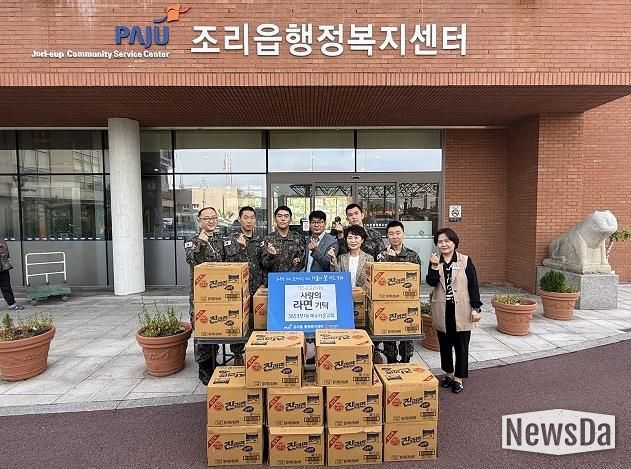 뉴스다 최광묵 기자 | 파주시 조리읍은 지난 2일, 3653부대 장병들과 예수가온교회가 추석을 맞아 지역 내 어려운 이웃을 돕기 위해 라면 16박스를 기탁했다고 밝혔다.