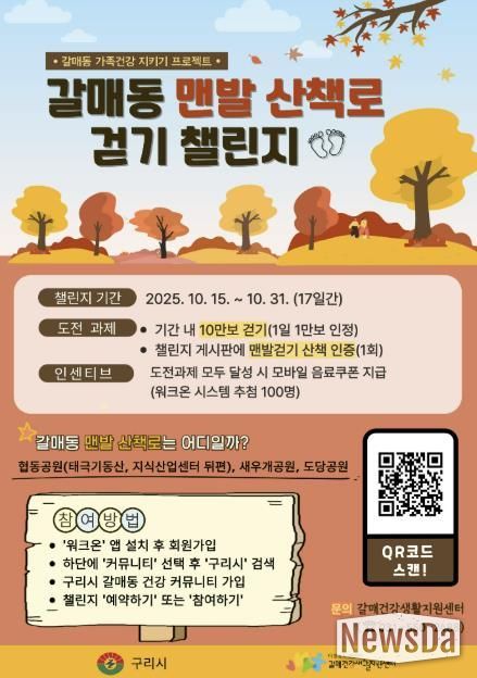 뉴스다 최광묵 기자 | 구리시는 가을철 주민들의 건강한 생활 습관 형성과 스트레스 완화를 위해 ‘갈매동 맨발 산책로 걷기 챌린지’를 오는 10월 15일부터 31일까지 17일간 운영한다고 밝혔다.