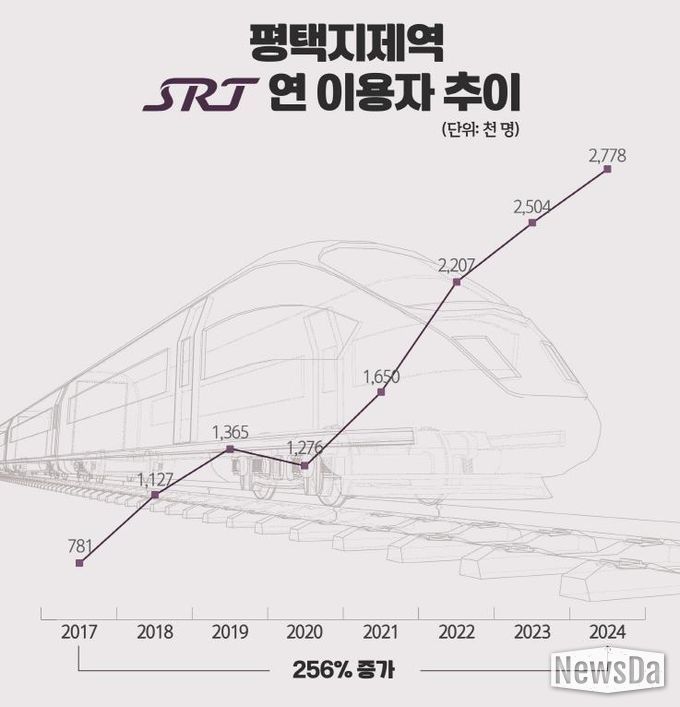 평택지제역은 2016년 개통 당시부터 SRT가 정차한 역사로, 매년 이용객 수가 꾸준히 증가하고 있다. 실제 ‘철도연감’에 따르면 평택지제역의 연간 SRT 승하차 인원은 2017년 78만 1천 명이었지만, 2024년에는 277만 8천 명으로 256%의 증가율을 기록했다. 이러한 증가율은 SRT 역사 중 가장 높은 수치다.
