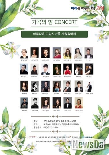 뉴스다 최광묵 기자 | 고양특례시가 후원하고, (사)한국예술문화단체총연합회 고양지회가 주최하며 (사)한국음악협회 고양지부가 주관하는 ‘2025 가곡의 밤 – 아름다운 고양시 8경(景) 가을 음악회’가 오는 16일 오후 7시 30분, 고양아람누리 아람음악당에서 개최된다.