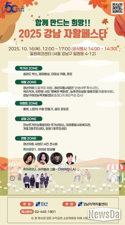뉴스다 최광묵 기자 | 꿈이 모이는 도시, 미래를 그리는 강남구가 10월 16일 낮 12시부터 오후 5시까지 일원에코센터에서 ‘2025 강남 자활페스타’를 개최한다.