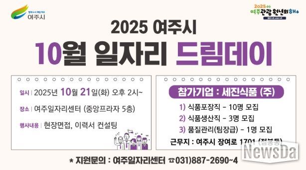 뉴스다 최광묵 기자 | 여주시는 오는 10월 21일 오후 2시 여주일자리센터(세종로 14번길 18, 중앙프라자 5층)에서 ‘2025년 10월 일자리드림데이’를 연다.