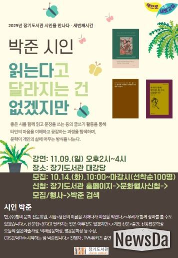 뉴스다 최광묵 기자 | 김포시 장기도서관은 2025년 공공도서관 독서프로그램 운영 지원사업으로 '시인을 만나다-박준 시인'을 오는 11월 9일, 오후 2시부터 4시까지 장기도서관 대강당에서 운영한다고 밝혔다