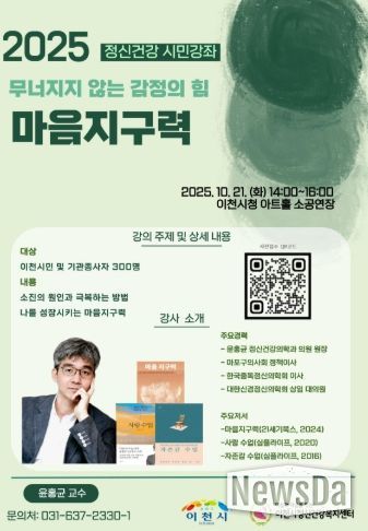 뉴스다 최광묵 기자 | 이천시정신건강복지센터는 오는 10월 21일 오후 2시부터 4시까지 이천아트홀 소공연장에서 2025년 정신건강 시민강좌 ‘무너지지 않는 감정의 힘, 마음 지구력’을 개최한다. 이번 강좌는 취업, 학업, 결혼 등 다양한 스트레스 환경 속에서 살아가는 이천 시민들에게 마음 건강의 중요성을 알리고 정신건강 회복의 계기를 마련하기 위해 기획됐다.