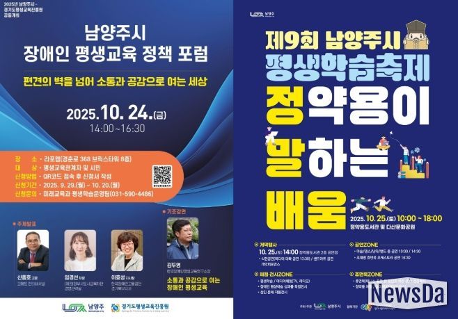 뉴스다 최광묵 기자 | 남양주시는 장애인과 비장애인이 함께 어우러지는 평생학습 환경 조성과 모두를 위한 평생학습 가치공유 및 활성화를 위해 오는 24일 ‘장애인 평생학습포럼’, 25일 ‘평생학습축제’를 연이어 개최한다고 밝혔다.