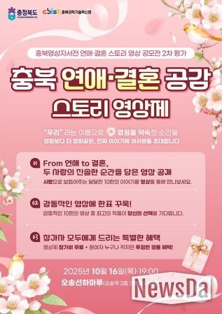 뉴스다 최광묵 기자 | 충북도는 오는 10월 16일 오후 7시, 오송 선하마루에서 ‘충북 연애·결혼공감 스토리 영상제’를 개최한다고 밝혔다.