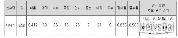 9~10월 MVP로 선정된 디아즈에게는 상금 300만원과 트로피가 전달될 예정이다.