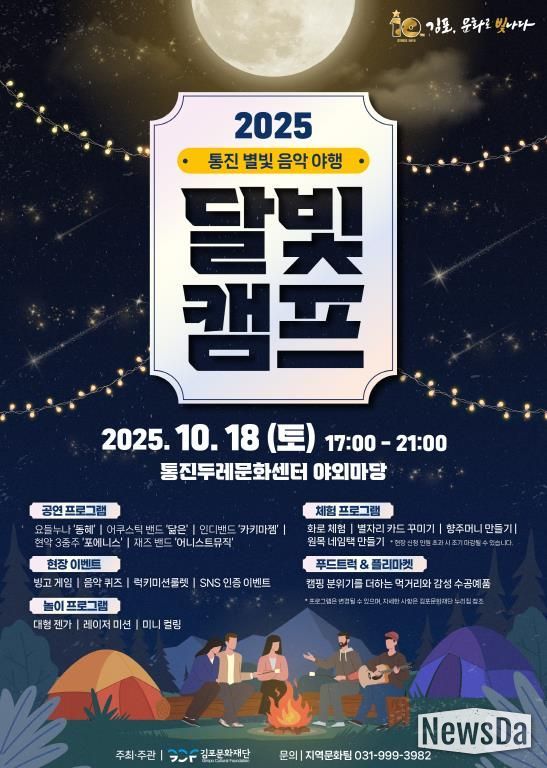 뉴스다 최광묵 기자 | (재)김포문화재단이 주관하는 2025 통진별빛음악야행 '달빛캠프'가 10월 18일 17시부터 통진두레문화센터 야외마당에서 개최된다.