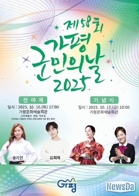 뉴스다 최광묵 기자 | 가평군은 오는 16일 오후 5시, 새롭게 리모델링을 마친 가평문화예술회관에서 ‘제58회 가평군민의 날 전야제’를 개최한다. 이번 행사는 ‘다시, 가평으로’를 슬로건으로 내세워 수해 극복과 지역 재도약을 기원하며 군민 화합의 의미를 담아 열린다.
