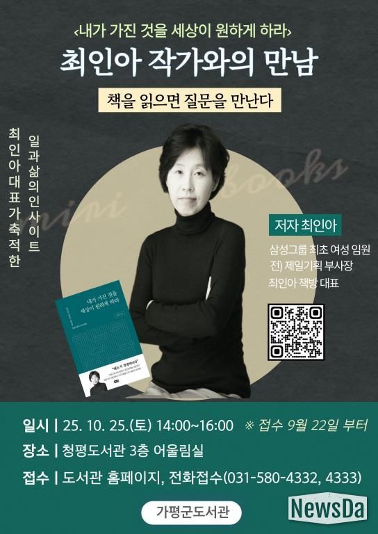 뉴스다 최광묵 기자 | 가평군은 이달 25일 오후 2시 청평도서관에서 ‘2025년 정기 작가와의 만남’ 강연을 개최한다. 이번 강연은 ‘최인아 책방’ 대표로 잘 알려진 최인아 작가를 초청해 ‘책을 읽으면 질문을 만난다’를 주제로 열린다.