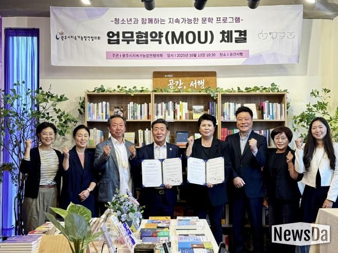 뉴스다 최광묵 기자 | 광주시지속가능발전협의회는 지난 13일 독립서점 ‘서행구간’과 함께 문학을 통한 청소년 지속가능발전교육 활성화 및 지역 문화 확산을 위한 업무협약(MOU)을 체결했다.