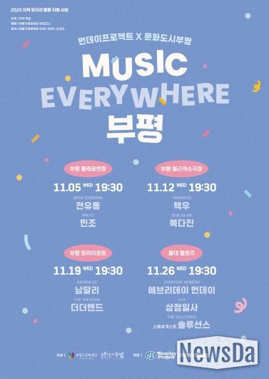 뉴스다 최광묵 기자 | 부평구 문화재단 문화도시센터는 오는 11월 매주 수요일 오후 7시 30분 지역 뮤지션들의 공연 ‘MUSIC EVERYWHERE 부평’을 총 4회에 걸쳐 진행한다고 밝혔다.