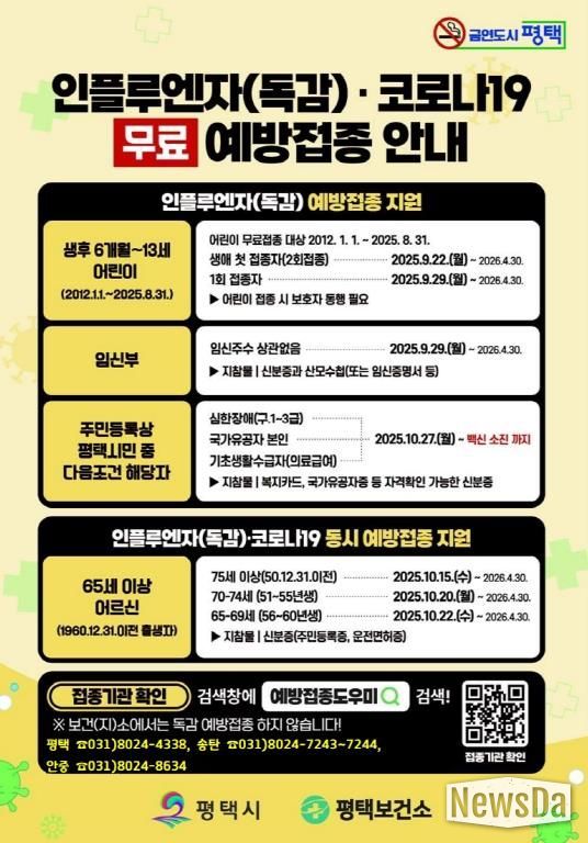 뉴스다 최광묵 기자 | 평택시는 오는 15일부터 2025-2026절기 코로나19 무료 예방접종을 지정 위탁의료기관에서 실시한다고 밝혔다.