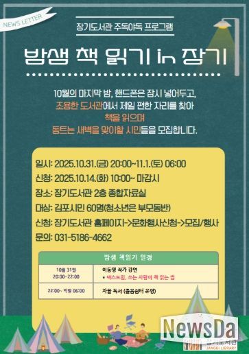 뉴스다 최광묵 기자 | 김포시 장기도서관은 주독야독 프로그램인 '밤샘 책 읽기 인(in) 장기'를 10월 31일 오후 8시부터 11월 1일 오전 6시까지 장기도서관에서 진행한다고 밝혔다.