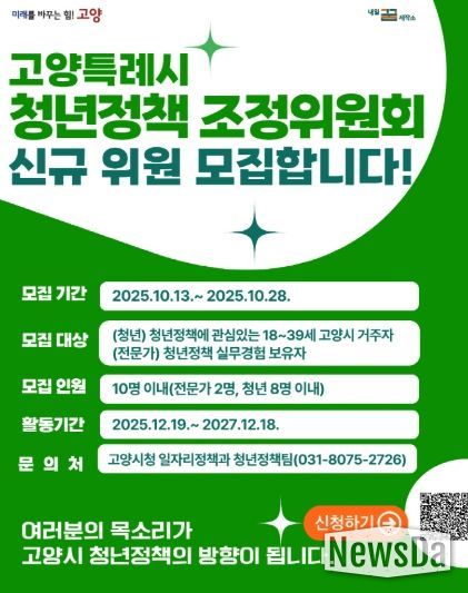 뉴스다 최광묵 기자 | 고양특례시는 청년이 시정의 주체로 참여해 정책을 함께 만들어갈 수 있도록 고양시 청년정책조정위원회 청년 및 전문가 위원을 공개 모집한다고 밝혔다.