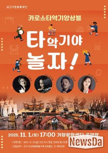 뉴스다 최광묵 기자 | (재)거창문화재단은 오는 11월 1일 토요일 오후 5시 거창문화센터 공연장에서 카로스 타악기 앙상블과 함께하는'타악기야 놀자!'를 개최한다.