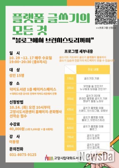 뉴스다 최광묵 기자 | 고양특례시 대화도서관에서는 글쓰기의 기초부터 글쓰기 플랫폼의 활용까지 배워볼 수 있는 독서문화 프로그램‘플랫폼 글쓰기의 모든 것’을 10월 29일부터 운영한다.