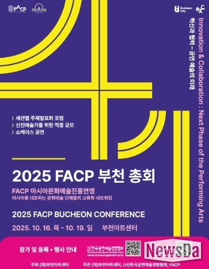 뉴스다 최광묵 기자 | (재)부천아트센터가 주최하고, (재)부천아트센터·아시아문화진흥연맹(FACP)·(사)한국공연예술경영협회가 공동 주관하는‘제41회 2025 FACP 부천 총회(Federation for Asian Cultural Promotion, 이하 FACP)’가 10월 16일부터 19일까지 4일간 부천아트센터 일대에서 개최된다.