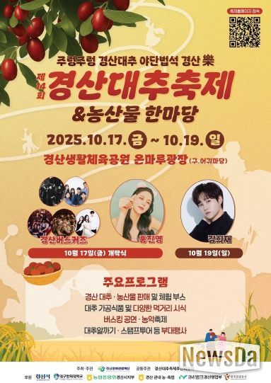 뉴스다 최광묵 기자 | (재)경산문화관광재단은 ‘제14회 경산대추축제 & 농산물 한마당’을 오는 17일부터 19일까지 3일간 경산생활체육공원 온마루광장(구 어귀마당)에서 개최한다.