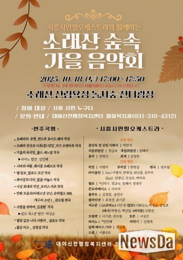 뉴스다 최광묵 기자 | 시흥시 대야ㆍ신천행정복지센터는 오는 10월 18일 소래산 삼림욕장 놀자숲 잔디광장에서 대야ㆍ신천동 지역 주민을 위한 ‘소래산 숲속 가을 음악회’를 개최한다.